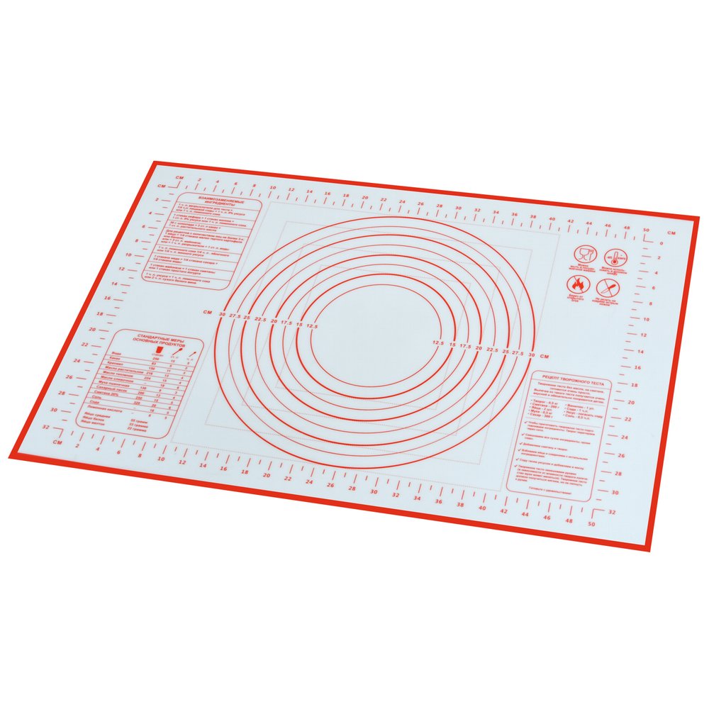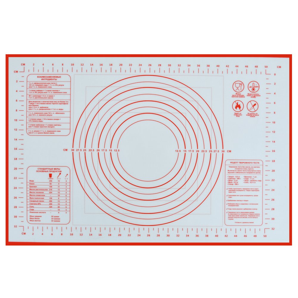 Коврик из силикона обладает антипригарными свойствами его можно использовать для приготовления пищи в духовом шкафу на противнях или в микроволновой печи (выдерживает температуру от -30 C до +220 градусов С), а также при хранении продуктов в морозильной камере. Удобно использовать коврик для раскатывания теста, а благодаря имеющейся разметке, вы сможете раскатать тесто в идеальный круг или порезать его на равные части. Для нарезки используйте пластиковый нож или кулинарный шпатель.