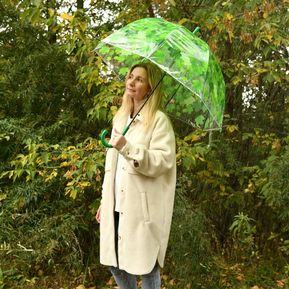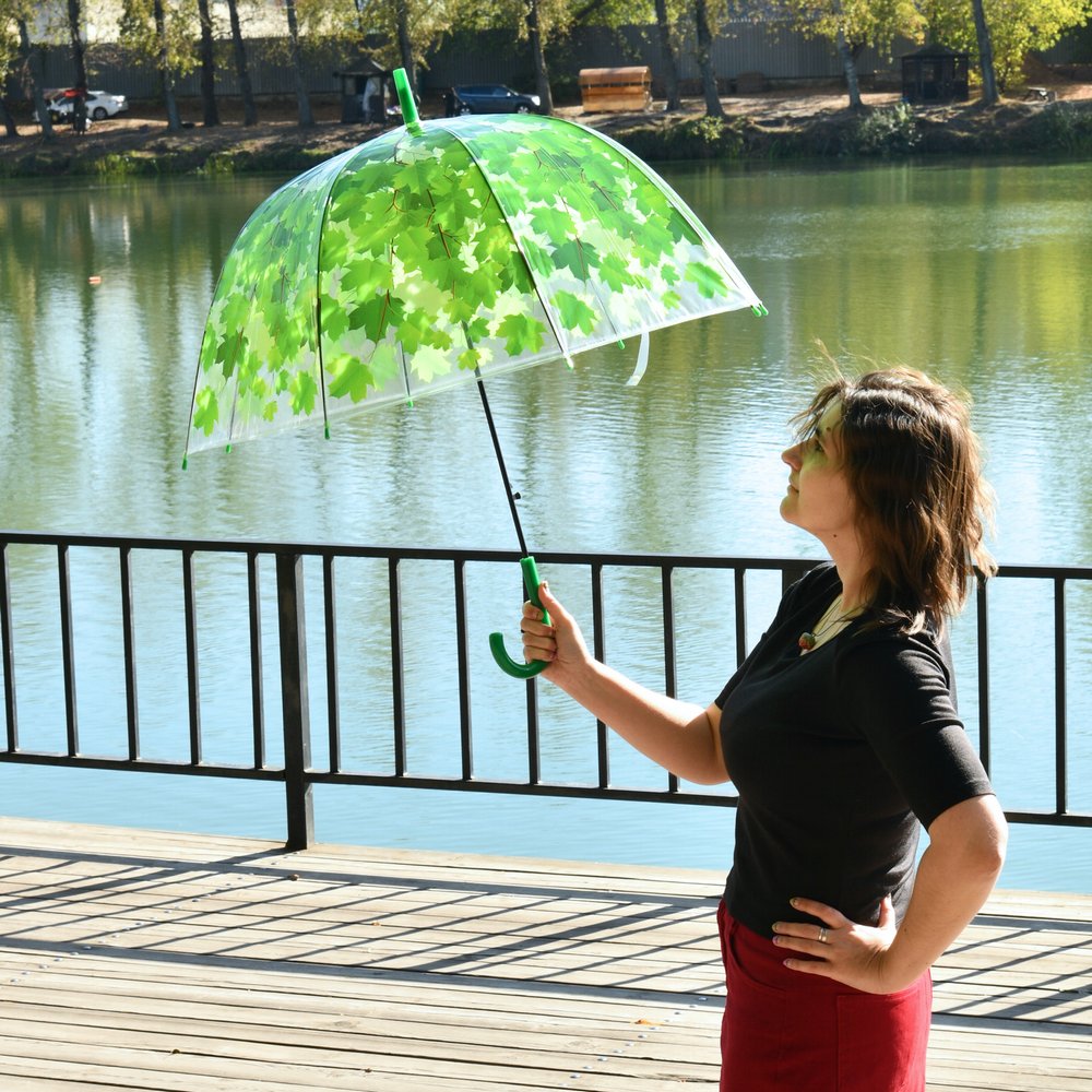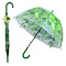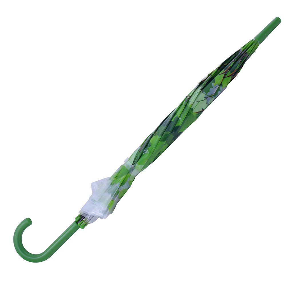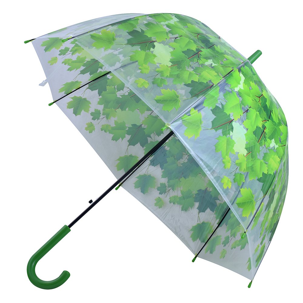 Полуавтоматический зонт — удобное и практичное приспособление для защиты от дождя и ветра. Купол зонта выполнен из полимерной пленки — прочного прозрачного материала с нанесенным рисунком. Рисунок с листьями смотрится стильно и привлекательно в любой обстановке, создает летнее настроение. Изделие имеет прочную закругленную ручку, за которую удобно держаться, за нее же можно подвесить зонт в перевернутом положении. Чтобы открыть зонтик, нажмите на кнопку, чтобы закрыть — потяните вручную за основание спиц. Изготовлен из полимерной пленки (полиоксиэтилен-POE) и металла, ручка из пластмассы.