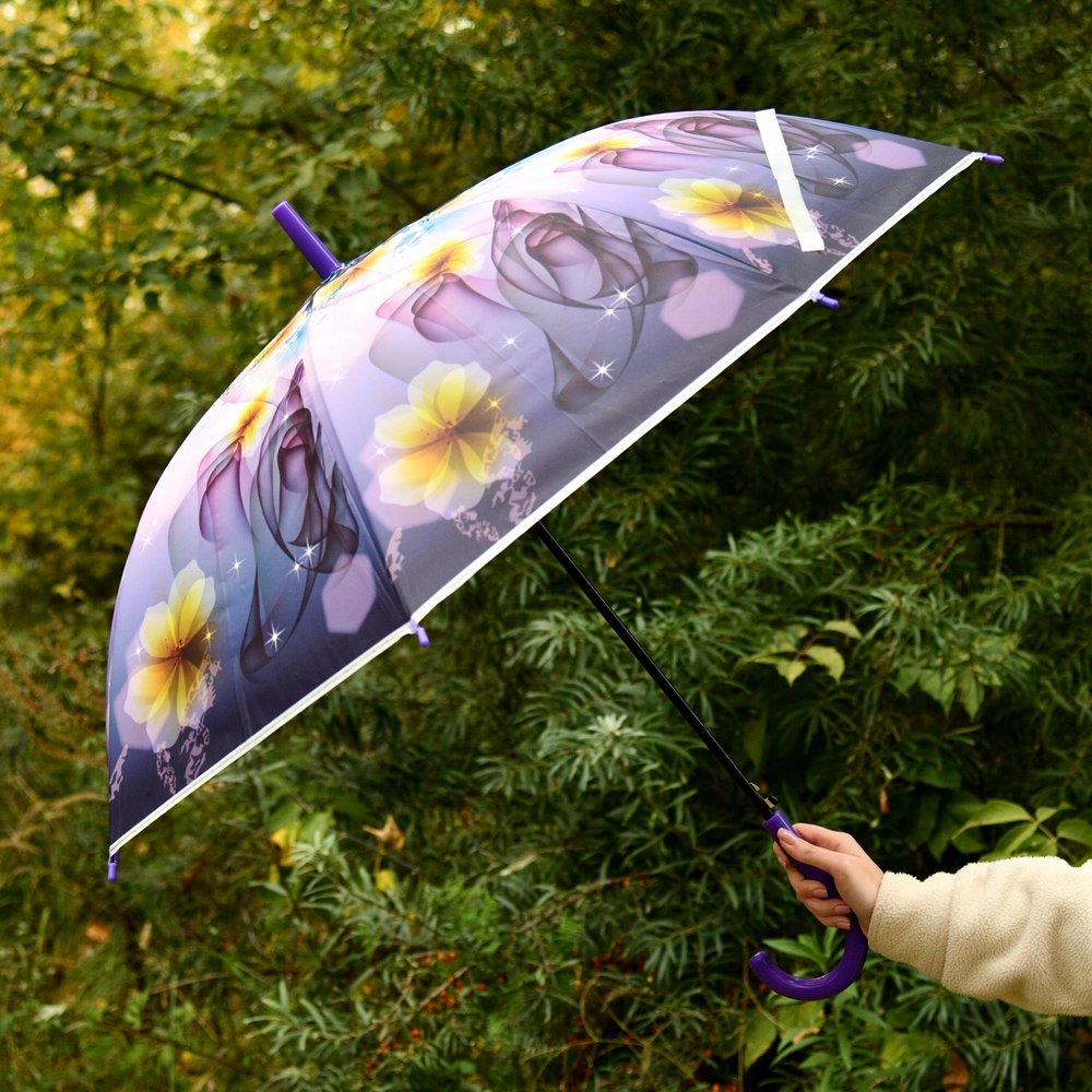 Красивый зонт с цветочным рисунком защитит вас от непогоды. Зонт имеет полуавтоматическое открытие — открывается нажатием на кнопку, а закрывается вручную. Большой купол зонта защитит вас не только от капель дождя, но и от ветра. Закругленная ручка обеспечит комфортное удерживание зонтика. Преимущество материала в том, что при загрязнении его достаточно протереть, грязь не впитывается. Изготовлен из полимерной пленки (полиоксиэтилен-POE) и металла, ручка из пластмассы.