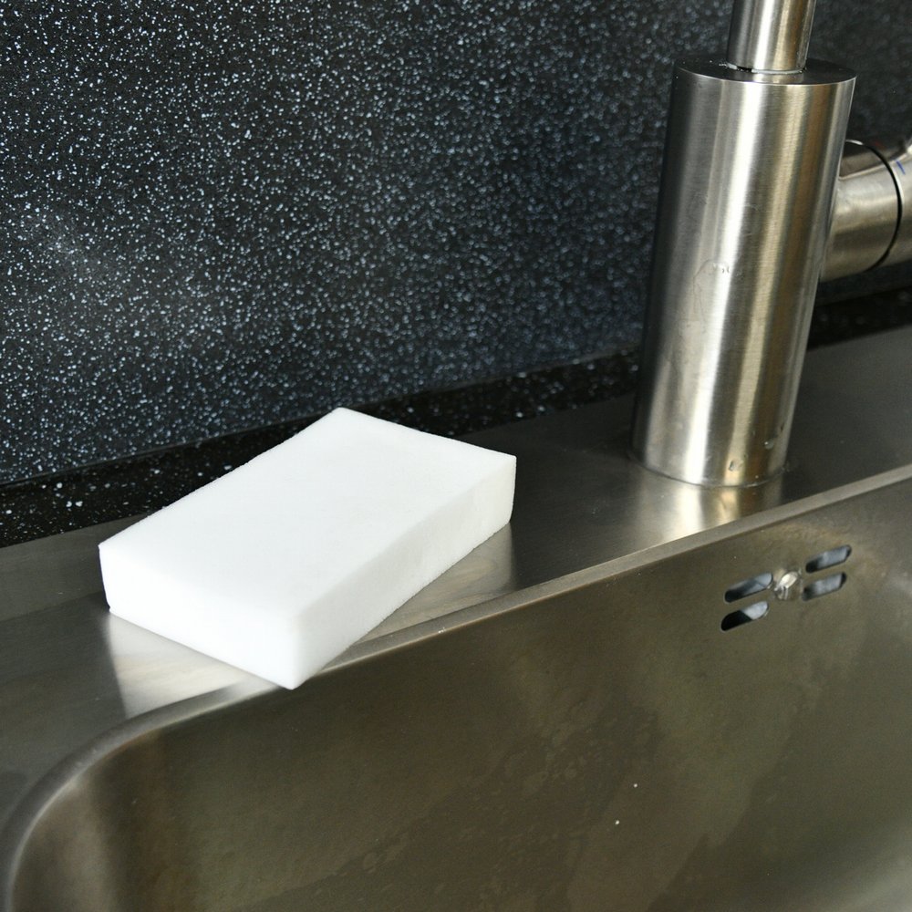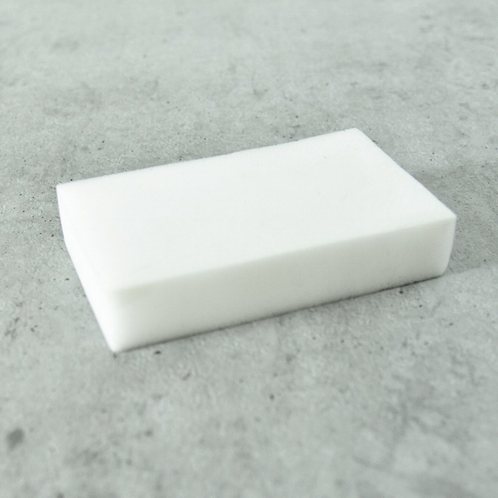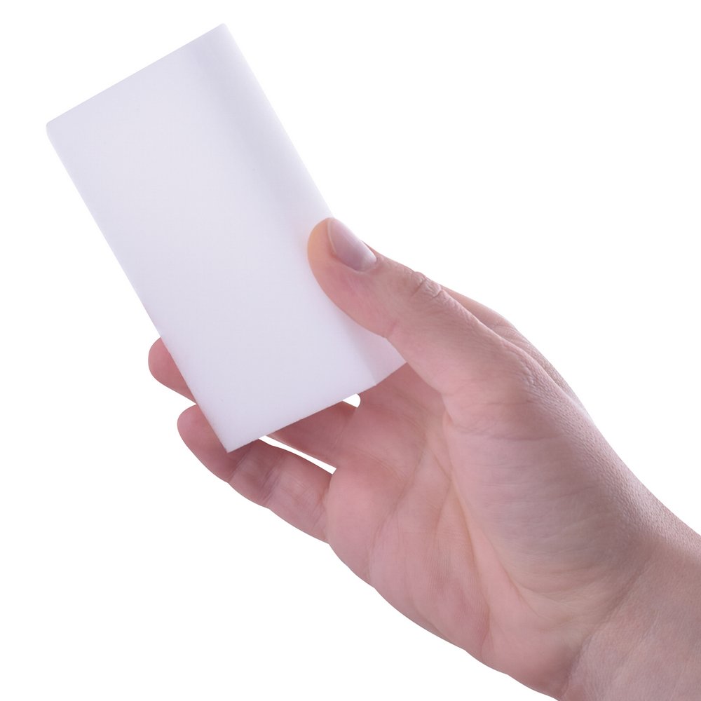 - Меламиновая губка справляется с загрязнениями различной сложности без использования химических чистящих средств, поскольку материал губкки может вступить в реакцию с препаратами. Поднесите губку к загрязнённой области, прижмите и надавите на неё. Ваши движения должны напоминать ластик для удаления карандаша. Используйте как уголок изделия, так и его плоские части, бока.